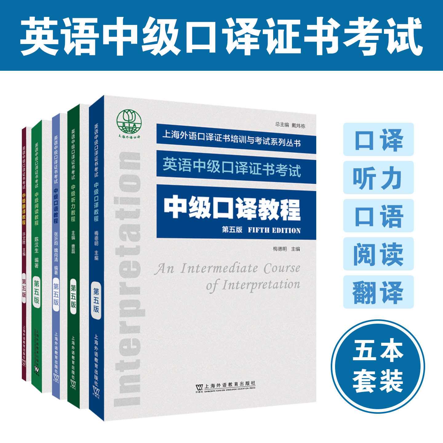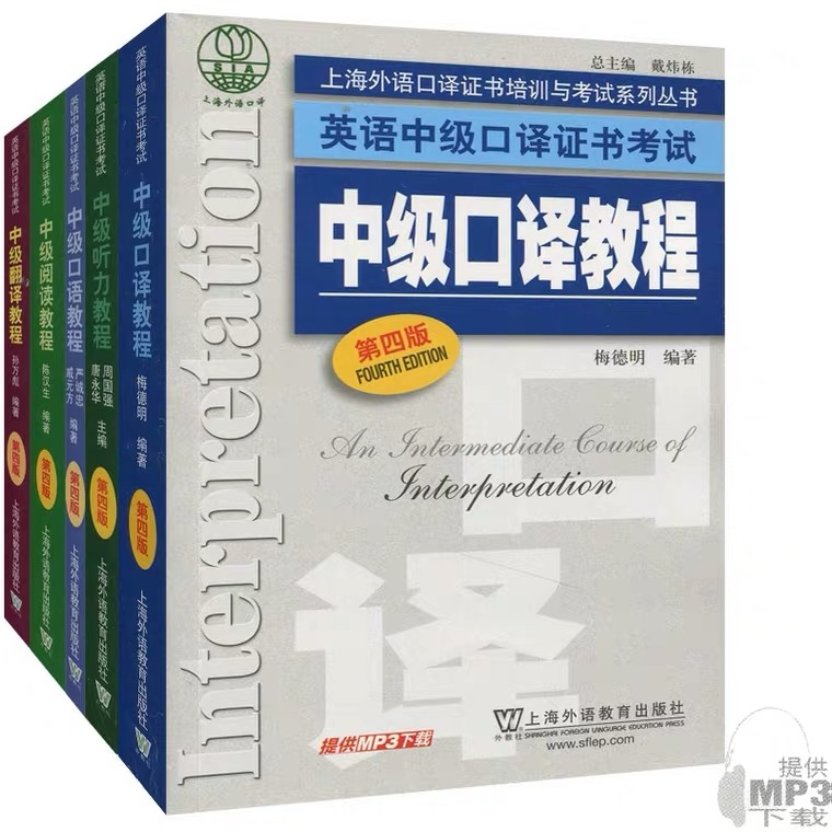 2、英语中级口译证书考试:分为综合笔试和口试。笔试合格者方能参加口试。综合笔试包括听力、阅读、英译汉、汉译英四部分,考试时间为150分钟。口试包括口语和口译两部分,时间约25分钟。培训教材为《上海外语口译证书培训与考试系列丛书——英语中级口译证书考试教程》(第五版,全套共五册),上海外语教育出版社:包括听力教程、阅读教程、翻译教程、口语教程、口译教程。真题为《英语中级口译证书——实考试卷汇编2016-2023》。